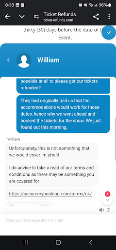 Read moreAbsolutely awful company. We purchased added protection in case we needed to make any cancelation for our Phantom of the Opera show in September, but when we made the request for a refund, they pointed us to a "Terms & Conditions" that had so many loopholes & Catch 22's that it's no wonder other reviewers lost out on their money. Horrible customer svc bc there's no real person talking to you, just a robot with extremely generic answers. Don't even bother going thru this company, you could be well within the 2 week grace period that they supposedly give you for canceling and also have purchased protection, but it's all a scam. Whoever owns LW Theatres as a svc is a downright horrible person that doesn't care about people and only cares about scraping money from others while they lose out.