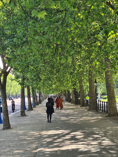 Lined with lush trees and British flags, The Mall is designed to provide a direct and grand approach to Buckingham Palace. It is bordered by significant landmarks, including St. James's Park and Green Park, which add to its picturesque setting. Clarence House and Lancaster House are also situated nearby, adding to the area's regal atmosphere.