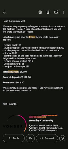 I had move out due to personal reasons so I requested them to find a tenant and terminate my tenancy as soon as possible so that I do not have to pay the rent during the notice period. After a week I find out that someone has moved in to my apartment, they didnât even bother telling me or taking my key and when I asked for my deposit back, they withheld ÂŁ185 for cleaning a tiny 1 bed apartment WHICH I WOULDâVE GOTTEN CLEANED PROFESSIONALLY FOR ÂŁ20 IF THEY JUST TOLD ME THAT THEY FOUND A NEW TENANT AND ASKED ME TO HAND OVER THE KEY A COUPLE OF DAYS IN ADVANCE. After repeatedly arguing with them about the absurdity of all this, they agreed to give back ÂŁ85 as âgood willâ.