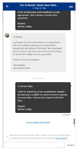 Thanks for your reply! I really like to apologise if I had overlooked something but I read our chat again three times and can´t find any compensation offer from your side. The chat ends with AirHost Team asking for patience while they´re working on a solution on 22nd Oct. 2024 and me reminding them on 24th Oct. 2024. I can´t find any offer from your side anywhere else on my booking platform Booking.com nor in my mailbox. Please lead me to where I can find your offer.