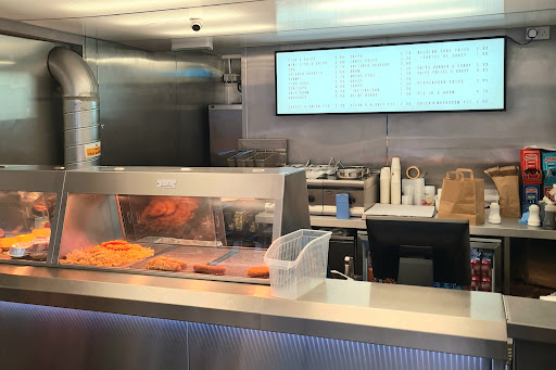 Fish and chips, Mini fish and chips, Battered sausage, and Irish curry sauce. To start with the positves, the irish curry sauce was probably the best ive ever had, really top and a must order. The chips were also just about as good as your gonna get with vegetable oil. Great blistered texture and Im assuming atleast twice cooked? They were crisp and fluffy, really nice. The portion sizes were reasonable. For the standard fish and chips you get (£9.70) a largeish container of chips and a small fillet of fish.. although when comparing it to the "mini fish and chips" I wouldnt be suprised if the "mini" is a trim cut off a larger fillet... mabye... in any case the fish was also good, and the batter light, airy, and not overly greasy. The battered sausage were served from the counter heater and to be honest, I weirdly enough prefer them like that, but I think most people dont, so probably worth flagging. Chips and fish were quickly wrapped and served without asking if wed like salt or vinegar... i think they were seasoned, but we wanted more vinegar and more salt... In summary, if your looking to wind back the clock to the good old days of Beef Tallow and Coal mines, you wont find that here. But if your looking for a good clean fish and chips that wont break the bank or an artery, this is probably worth a shot and with a few small changes this could be one of the best chippys...