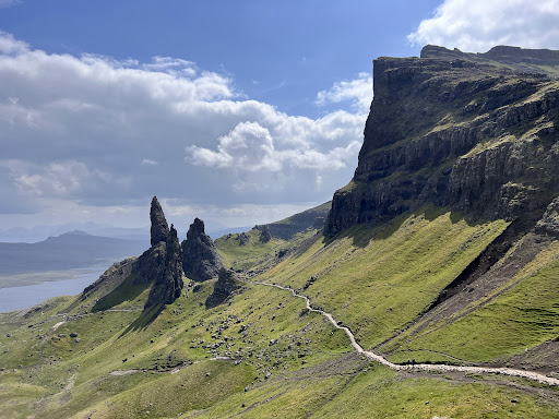 Read moreThis spectacular rock formation really has to be seen during any trip to Skye. The only issue is its popularity - at peak times, the roadside and verges are parked up (and churned up) for hundreds of yards around. But get there when the selfie-takers have left and it is a magical place. There's a steep and continuous path up from the car park to the classic viewpoint, which though strenuous is not technically difficult. It starts well surfaced, but recent torrential rain had washed out areas of the path higher up and left lots of churned up peaty quagmire. As a result, substantial waterproof footwear is strongly recommended. For those with more experience in the hills and a better head for heights, I would recommend ascending to almost directly below the spire of the old man, then turning acutely back to the left up a fainter track, which takes you amongst the subsidiary outcrops and away from the hordes. Continuing south along the plateau between the shards eventually leads to an exposed path along the top of a crag, which turns back towards the old man for spectacular views. I would recommend only taking this route if you have experience in the mountains, but the view and isolation are worth the exposure. Our just continue up the main path for an easy and safe route to the crash top providing the classic view, and return by...