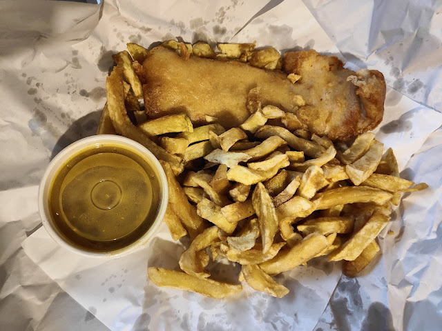 Ordered regular fish and chips with curry sauce. Came to £9.50 odd which is about average these days.