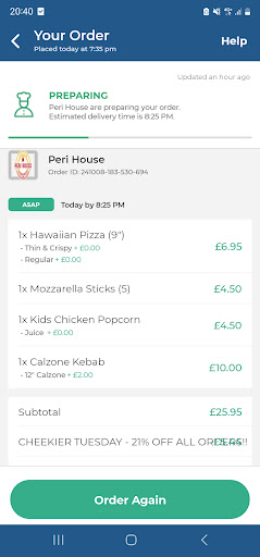 Crazy takeaway shop, placed order at 6:00pm and booked the delivery time at 7:00pm, they had updated the delivery time to 7:15pm.....Finally arrived at 8:55pm. This is my fifth time to order foods from your shop ,of course I had already wrote down my house number and address , do you need my order photo ? And also wrote these in the comment as well. I placed order by using peri house app, I have the record in hand.If this is the bug of your app, please modify it. And the truth is , I got my order in 55 minutes after we'd called you. Not 15 minutes as you said. We have 3kids at home, they are 8years , 2 years and six months old, We must keep our phone in silent mode because the baby is always in sleep. Please note: I placed the order not for waiting your calls! And you have no right to complaint about my phone because of the existing bug in your app. My suggestion to this shop is: place order by just eat , don't use peri house app which is a...