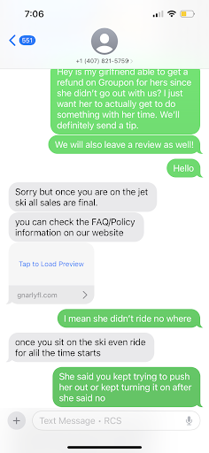 Purchased an hour of time to ride a Jetski from Groupon. After I purchased the service, I was given a phone number to call to make my reservation. I called the number and no one answered. The recording stated the voicemail wasn’t set up. I’ve never called a business that doesn’t have a business recording and also doesn’t even have voicemail set up. I then sent an email to request the reservation and later received a text from the “company”. Whoever was messaging me said I needed to pay a $30 reservation fee and a link to their website to pay. The link allows you give purchase a “none refundable” reservation.