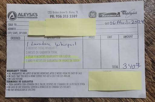 Read moreSi hubiera un zero, le pondria un zero. Porque dicen q tienes 1 año 9 meses de garantia en labor mas la piesa. Mi lavadora se descompuso del switch de la puerta, me dice el Sr. Alejandro, dueño, q se puede poner un switch nuevo q serial 75 dolar incluyendo vuela ($25) y piesa nueva o $45 por quitar la piesa dejarlo directo ($25 de la vuelta y $20 por hacer el trabajo). Le dije q tengo mi garantia q dice incluye labor incluye labor/trabajo por 1 año 9 meses y que nadamas tenia q pagar la vuelta. Dijo q no, q tenia q pagar por "el servicio" osea la labor. Le dije q porque me dieron la garamtia si no la van a respetar. El señor Alejandro dijo "Señora ya no le voy a respetar su garantia, queda anulada". Compre mi lavadora Abril 2024. Y no se respeto mi garantia de labor/trabajo . Este señor no reapeta lo que dice...