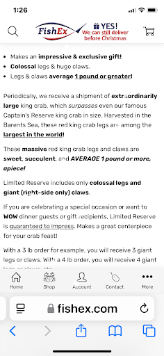 Horrible service! Website extremely misleading. Ordered ( or thought I was ordering) 5 lbs of fresh, specifically never frozen king crab ( @$69 or $79 per lb. FishEx had a specific time window for the never frozen crab , ending on Nov 2, 2020. I wanted this for my wife's 60th birthday . Having lived in Juneau AK for a number of years, we always had fresh King Crab available, never would touch frozen, even FRESH frozen, it's still frozen. Once frozen, meat is rubbery, watery, and tasteless, ick! On Nov 4 , I received the styrofoam package from FishEx, as promised. Opened and found 5 lbs of frozen crab! It took 2.5 days to thaw in refrigerator the King Crab was predictably, rubbery, and complete tasteless. Not the tender, flakey, and sweet meat that is the trademark of never frozen King Crab. So dissatisfied and disappointed. Sent email to Customer Service regarding the order and received the most rude reply stating I received what 'I had ordered'! Period! I replied back and asked then why was there a specific time frame stated on the website for the fresh? She sent another curt email saying that was for the ' fresh frozen'. End of subject. No attempt to try and correct the rectify the problem, unlike most other quality reputable vendors out there! Stay away from this 'fishmonger'!!! If you want King Crab ( frozen) , go to your local Costco, $11/ a lb not $59-and up like FishEx. Consider yourself warned! Absolutely horrible experience with this...