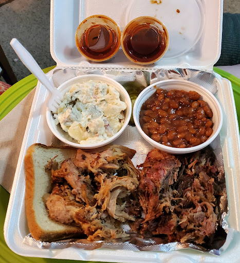 I got 4 ounces each of pulled pork and beef, I opted for just the meat instead of a sandwich. It was a generous amount and was pretty good. The meat needed salt but that could just be me, I'm one of those people always saying add salt.. The baked beans were good but they're not knocking Mom's off the top of my list. I loved the loaded potato salad! She described it as a "loaded baked potato turned into potato salad" and it was exactly that. Really tasty! The only thing I wasn't happy with was the barbecue sauce. It was very vinegary and after a couple bites, I tossed it and got a bottle of sauce from the fridge. I paid $15 for everything. It was a generous, filling serving. If I see them in Joplin again, I'll stop, but I'm bringing...