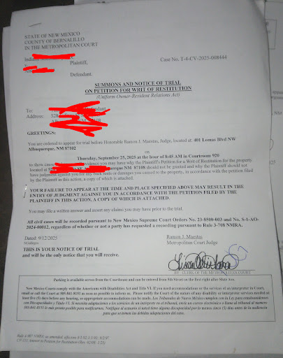 The Security downstairs segregated my entrance,and called me "The crazy ones", because I wouldn't speak to my bullies*, while I was being discriminated against. The most grotesque way, Public, ( as they called out for me to enter different . Enough to distract everyone in line, at 8 am 09/25/2025 for my 8:45 am hearing. The customer service desk refused to help me. She laughed, I replied, " Well, thank God I don't know the layout." I had a Unfair trial with Judge Ramon Mateas, he didn't even look at one of documents, from CABQ grievance, My housing contract, or my filed paperwork, he had a sinister smile. Ruled against me, say "I didn't try hard enough." *New Mexico has not only chosen Racial Segregation for me, but actual Jim Crow court cases for myself, also. I have to get legal help, because your city is Lynching me in the Daylight. I have yet, to Break any law, he gave me 14 days to evacuate my home, after a mistrial. I never received the documentation that he brought as a evidence, it never existed before yesterday. **He wouldn't look at any documentation I provided to the court 09/18/25. The resources I told the judge I went to, he repeated back to me, as places I needed to go. I really need someone to hear the court taping of my hearing, but I have contacted my embassy. Now I know, that even in the courts, I am not safe, from your security guards, your customer service desk, and unfair trial and Doctored evidence. Why would I not tell the truth, when you've already harmed me, in more ways than you could imagine. I refuse to hate myself, and I love my skin, even if it doesn't register a human to you. You ridiculed me for not doing the work, I just told him I did, and allowed my defendant to approach his bench, (*with fake evidence )as if they knew each other. After I begged for my human rights and explained my social security number is being used to gain funds, for the rent hearing I had.