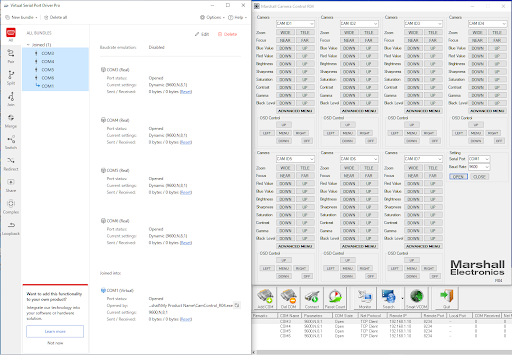 Read moreI am a freelance video technician who also works on ob-van broadcasts. During the production of sporting events it often happens that POV box cameras are used. We recently replaced them with Marshall CV504 which have the advantage of having the parameters remotely controllable via the RS 485 serial port. Since the cameras are positioned far from the OB-Van, for the transport of the video signal we use HD-SDI to fiber converters which also allow the transport of the RS 485 serial signal. On the OB-Van we convert the serial signal with PUSR serial RS485 to ethernet converter, one for each camera. The reason why we convert RS485 to ethernet is to be able to control the cameras from any point of the ob-van where there is an ethernet port on our network. The driver software generates a virtual COM port for each of the PUSR converters that the PC detects as a real com port. The Marshall camera control software only works by connecting to the cameras via a single serial port, so you have the problem of connecting a virtual com port (the one selected in the Marshall software) to two, or more, physical com ports (real com port) . Using the Join real COM ports functionality we can control multiple cameras with a single Marshall GUI. I found Virtual Serial Port Driver Pro extremely versatile but, at the same time, intuitive and easy to use. VSPD provided me with the solution for a particular need that I didn't find with other...