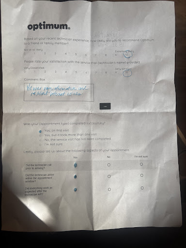 Read moreOur internet at our engineering office has been intermittent for weeks. I called for service was told it would be about 2 weeks. They finally showed up and did absolutely nothing that I could see to fix the problem. The intermittent outage persisted. I immediately called back, and I was told it would be about a week or 10 days before they could come back. They finally came back yesterday. I was told that the problem was area-wide, but tech support on the phone had told me differently. The Optimum "expert' kept overtalking me the entire time. I finally asked him to stop talking and let me finish my sentences--that this problem has existed cyclically for years, and that our firm could not operate without steady internet service. He turned around and walked out refusing to listen or give me the assurance I needed that my problem was solved. I guess I will find out today. I wish Optimum would be more responsive, especially for business customers like us who really need it to operate efficiently instead of going home to try to use the internet reliably for Teams or Zoom calls, which is a large part of our work. I am surely hoping that he was right that our area-wide problem was fixed.