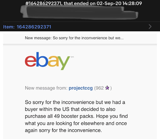 I bought vintage items off their eBay account âProjectCCGâ. A short while later I get a reply saying my already-bought-items have been sold to somebody else (in the US).