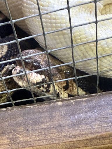 Above the sad sight of the alligator was a whole stack of very large snakes stacked on top of each other and crowded under one heat lamp, they had a kitty litter box for a bathtub. That's just unacceptable for snakes the size of a human being.