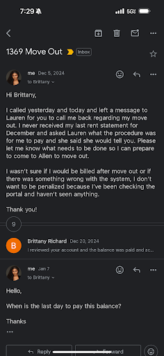 I've tried to wait until I was herena little minute to give an honest of a review as possible. Ive been here since November 2024 and I will start by saying as someone who downsized from a house to an apartment the unit and property are nice overall. It's been forever since I have ever lived in an apartment so I did ask about the process and fees etc to see what was my quickest option because I wanted to move quickly if possible. But my initial experience deserves ZERO stars. I did my app on a special of if you applied or something you got some type of deal...long story short I toured, picked the apartment I liked, did the app paid the fees etc. I was approved conditionally and when I asked what that meant I was told "oh a 3rd party does our credit checks" I was told to pay a full months rent as a deposit and I was shocked because I knew I had great credit. I begin to ask more questions as to the criteria of how the decision was made and someway between them or the 3rd party was told that it was because of charge offs. I explained to them that I didnt have any charge offs and ultimately was told they cant do anything about the misinformation, whatever the 3rd party says they have to go with and I can reach out to them but it could take 30 days...(which I didnt have)...so when I looked into the 3rd party company they had a 1 star review with HUNDREDS of people with the same story of having great credit and being denied homes or other things because of their misinformation. This was so frustrating because I paid so much more for a deposit than I should have and I just felt like they didn't even care that the company was providing misinformation. So for me that already had me rubbed the wrong way. but whatever, paid the deposit and moved in...everything is fine overall... Then there have been several times as a new tenant where I have had questions about where things are or just any questions in general and Emma has to be the most incompetent person because she answered NONE of them and just rambled in circles leaving me more confused than before I asked the question. The newest thing that has prompted this review is the fact that I paid part of my rent early and I go in to pay the remaining balance and it's more than what my rent is. So I call the office to ask why from yesterday to today is the amount that I pay monthly more. Lauren proceeds to tell me "it's because my water hasnt been billed and it doesnt get billed until 60 days later" and so I have my water charges just now being added on there from November...huh????? I continue to question that because that doesnt make any sense...every month on the portal it shows water charges so now you're trying to tell me that I never paid for water, that can't be true. Then she proceeds to tell me not to look at the portal because that information isnt accurate and to look in my email from a company called conservice (or something like that) and that's where I will see my billing break down and receipts. again...HUHHHH??? When was someone going to tell me to expect an email from them, and that the portal wasnt accurate etc etc. and im expressing to her that this is frustrating because I made my partial payment based on what I wanted to make the remaining payment and now I cant even make the remaining payment because it not correct even though the portal is saying the same thing my lease and every other document I have says. This is just so frustrating and I am so exhausted with the communication of the staff...like this should not be so stressful. I am beyond pissed about this. The only reason I give the 2 stars is because maintenance help greatly with an electrical issue that was going on in my unit. But effective communication is almost non existent for this to be the place you pay to live. I've recommended people here who planned to move here soon but I almost want to tell them don't do it. This are not simple overlooks and to blow it off as if it's not a big deal is again making me just question the integrity of this place just like with the...