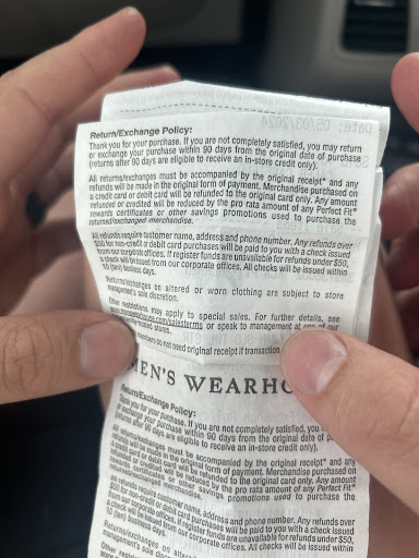 Read moreI'm not sure why we decided to do this because we have never had a good experience at a Men's Wearhouse, but we hoped this one would be different. Came here to get an outfit for our anniversary pictures about a week ago. We waited about 10 minutes before anyone approached us to help and the help we were given laughable. The associate was very rude constantly making derogatory comments about my husband's weight throughout the whole experience. The sizes that he picked for my husband were way off so we wound up just making a guess and trying them on at home to escape the whole awkward situation. We were told by the same associate that the return policy was 90 days. My husband tried the clothes on at home for just a few minutes. We didn't wind up using them for the pictures and tried to return them but when we got to the return, we were only then told that the return is "up to management" and the "tags being removed was unacceptable." The tags are not mentioned in the store return policy. I have attached a picture of their return policy below. It does state that it cannot show signs of wear but nothing about tags. To be clear the clothing does not have signs of wear beyond some wrinkling on the shirt. The shirt was already wrinkled when we bought it from someone else...