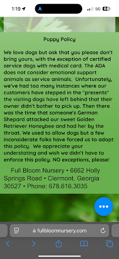 He didn’t ask for her certification or her papers. Nothing. If he had even asked her what her medical condition was, even though rude, she would have told him. When she explained about the website, he said “well I guess we’ll have to fix that”.. So if you are a military vet with PTSD, if you are partially blind, if you are Epileptic…. Whatever the beautiful reason is you have been blessed with the service dog, please note you are not welcome at Full Bloom.