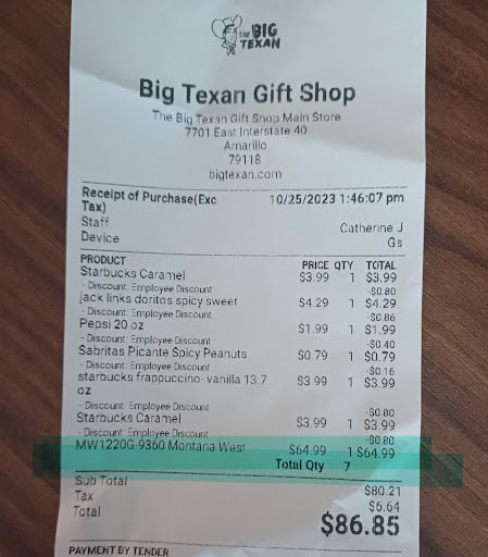 Loved the steaks and restaurant. The gift shop was wonderful accept for one very rude gentleman. He mocked me for not seeing the buy 2 get 1free shirts. Then he was rude and just wanted me out of the gift shop when i tried to explain things weren't clear. I even ask for help when i was picking it the shirts and they didn't help me know which were the free shirts. I'm sorry i never got my free shirt even though i paid full price for 3 shirts. If the guy had just taken half a second to explains thing clearly instead of acting like was such a burden, i would have gladly...