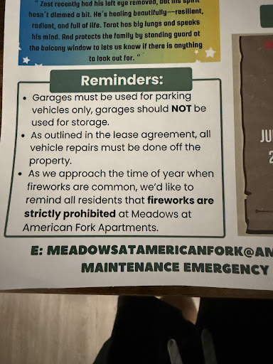 Cons -The walls aren’t super sound proof. We never heard our neighbors to the side or below us, however we could hear our upstairs neighbor all the time just walking around. -I know they get a special deal on internet and cable, which is so great if you don’t have streaming services. However, we don’t use cable and rely more on the internet, which was unreliable and slow at times. I work from home and have to do lots of video conferencing, and it just wasn’t up to par. We never contacted the office about it because our neighbors did, and even after multiple service calls they said there was nothing they could do to improve it. -I really think the residents should have gotten a small break on rent during the COVID crisis when the pool, hot tub, workout facility, and clubhouse were all closed for a few months. I’m positive that our rent pays for upkeep on those amenities and if we can’t use them, we should get a small amount of that back. Even $10 a month would’ve been a decent way to show their appreciation for our patience during the closures. -The power went out at least 3 times over the course of the year. Once for just a few minutes and the other two times for at least a few hours. I was unable to work during those times, which was a bummer. I’m not blaming the Meadows, because that could be just Rocky Mountain Power. -They do require you to either get your own renters insurance or pay $10 a month with your rent. No one mentioned that to us until we were signing the lease. -It was a bit of a pain to get approved to live here. I understand they want to make sure you can afford it, but we have a mortgage now and it felt like that was easier to qualify for! -I think the lawn maintenance company should have to park on the street in the winter. They have large snow plow attachments on the front of their trucks that make it so only one car can pass at a time. -The paint does seem to be on the cheaper side, I would suggest not using 3M products to hang anything. -They need to install a mirror at the southeast end of the property so you can see if another car is coming around the corner. You have to be very careful so you don’t get in an accident.
