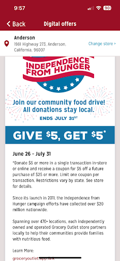 Read moreI would like to rate this store 0 stars, however, that is not a choice I have been given. Yesterday evening I did a shop in the Anderson, CA store. At checkout I found my pin for my card did not work. The owner of the store said that he had seen shoppers set their pin over the phone. I attempted to set my pin. I was informed that I had to set my pin in the office. The owner of the store told me he would put my selections in the meat locker, I could have my pin reset in the morning, come back in the morning and not have to re=shop or reselect the items I had attempted to purchase.