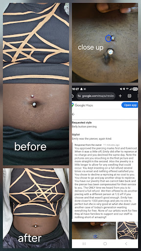 Read moreI got a belly piercing here and was initially happy, the piercer Emily was kind, and the shop felt clean and calm. However, within minutes of leaving, I noticed the piercing was crooked. I returned within about 10 minutes to voice my concern and was told it looked that way because of the jewelry length and would “heal straight.”