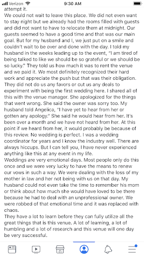 While this venue is absolutely beautiful and the staff is nice, I would not recommend this place. This may be long but I highly recommend you read! -We booked this place in August for our December wedding mostly for the Chapel, this is the only place nearby with a chapel. They kept promising and promising that it would be complete well before our wedding, when in fact it was not. When we showed up for our rehearsal on Thursday there was scaffolding in the middle of the chapel and we had to rehearse around the scaffolding, so I couldn't visualize what my day was going to look like and how my bridal party was going to stand. We weren't warned or informed that this was happening either, we just found out when we showed up. As well as that, we all felt very rushed and only did one run through, because they had another rehearsal after ours. Then they promised to have everything removed and cleaned up by 9 am Friday morning the day of my wedding so we could get in to decorate, when they didn't actually show up to clean up until 10:30 and didn't have it empty until almost 2:30. -About a week before my wedding my mom and I were randomly informed that we had to have all of our belongings removed from both the bridal suite and groom's suite before our ceremony started. I didn't have my contract on hand so thought maybe we had missed it. I proceeded to check our contract and nowhere in it does it say this. The day of my wedding we were informed again and I was not comfortable with this, we booked this place for the day, not for a few hours to get ready. I was not okay with stressing my bridal party out and having them clean up in their dresses & heels/suits. My mom told her we weren't stressing out to get our stuff out when it wasn't in our contract and she received an argument and a very rude response. -After my wedding I was told by several family members and several guests that they had seen staff members eating our cupcakes off of our cake table, I would not have minded this if they had been offered but they seemed to have taken them by themselves. As well as owners just hanging out in work clothes and completely ruining several of my photos by being in the background. -This may have been something we should have checked on but still find it weird. We booked our bartenders, DJ, and photographer through the venue with their package. During our reception I notice our photographers sitting at one of our guests' tables eating our catered dinner. I know they have to eat but was never informed they'd be eating our food and sitting at our tables. As well as after the wedding we realized no one came home with any leftover food so we checked with the caterers and they said that there wasn't any food leftover and that the Dj, bartenders, owners and security all had a plate. We were never asked or informed that all these people would be eating.. We paid our deposit with the knowledge of it being an exact amount we would receive back without any damage. A month after I received a check in the mail for about $100 less than our paid deposit, I reached out as to why it was less and was informed it was tax that was missing. When I checked with my mom she reached out to check as well. She was told it was because we paid with a credit card and they charge a card fee, which still doesn't equal $100, but that they realized it wasn't in our contract so they were sending the difference owed via check in the mail. After 2 more months of waiting for a check we checked in again and they said it was sent but that they'd cancel it and write a new one to be picked up, I sent my husband and the gate was locked and no one was there. We got it figured out and was sent a balance via venmo. At this point I am only missing $33 but checked anyway as to why. I'm informed that this is because we paid an amount + tax and the $33 is tax that we don't get back, which wasn't stated in our contract, our contract just had the amount in total including the $33. I know it is just $33, but being told 3 different things as to why money is missing...