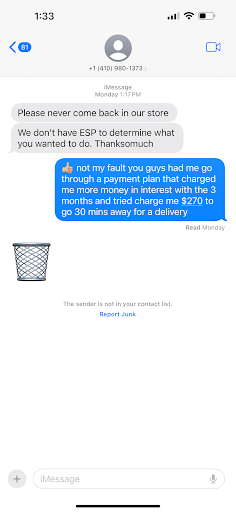 While purchasing the second bedroom set Josh got in an argument with a group of people who had come in to look at furniture after he was inappropriately rude with a two year old child that was acting out in the store. The child's mother became understandably upset. We didn't feel what Josh had done was inappropriate enough for us not to do business with him but it should have been cause for concern because it foreshadowed what was going to happen with our experience later.