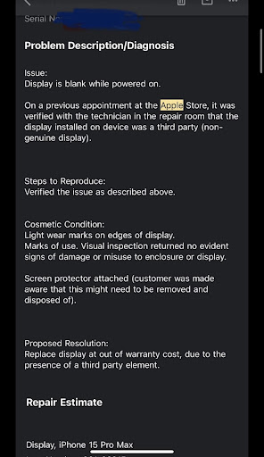 Attached is an email confirmation from Apple saying the screen they put in is fake.