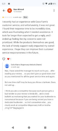 Not happy after my last experience today. First off, I have been going to coco for awhile now and have been getting the “spend 85 and get a canna lean free”. For every time I have gone (which has been multiple times) I have been given the larger canna lean. It has never been an issue before to get a large lean and today the associate that helped us goes on to say that we only give the little ones and we were never giving out the big ones. That was confusing because this was the first we had heard of this and we’re a little taken back. At first, the associate was going to make the exception who also was manager, but then another associate whom also so happened to be managing claims he’s uncomfortable selling us the larger canna lean and takes it away. Not going to lie, I don’t think that was handled very well. I have also been a customer for years (since they opened in fact) and from a managers point of view they should have honored it. Especially since we only asked for clarification and want to be on the same page. I kind of wanted a refund and wanted to go somewhere else but didn’t have time. I do not like writing reviews like this, but coco farms needs to be on the same page because that was unprofessional the way it was handled. I will not...