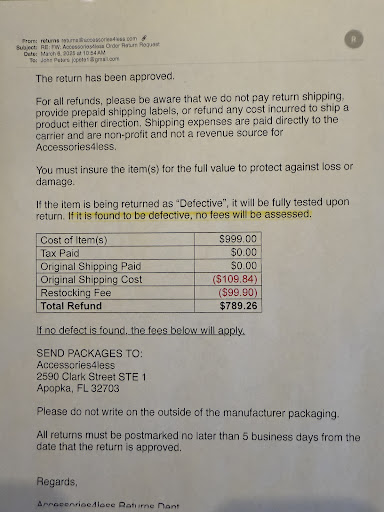 I would not recommend Accessories4Less for big-ticket items like AV receivers or anything else. Their prices look attractive, but the return policy is very unfriendly. The website's condition section for the unit I purchased reads "you might even get something better than new" — thoroughly cleaned, tested, and renewed to original condition", that "Yamaha product undergoes such close scrutiny" and "Yamaha's refurbished mean “as new.” This is far from the truth because the a/v receiver I received was defective and showed signs of wear. I started the return process and talked to Austin on the phone. He said they’ll check the unit out to determine if it’s a defect, and promise no restocking fee if it is' yet when I returned it I still ended up losing over $130 in shipping and restocking fees. Other customers have had similar experiences and lost more. They don’t send defective items back to the manufacturer — instead, they inspect and test them in-house. they don't use certified technicians, therefore it's impossible for them to properly diagnosed the unit to issue a refund as fast as they issued my reduced refund. In reality, you’ll be charged fees regardless if it’s defective or not and the next customer may get that defective unit. If they decide it’s not defective, you will pay return shipping both ways(yes, they will deduct/charge you for the initial free shipping plus you have to pay the fee to return it) plus a 10–15% restocking fee, even if the product arrived in poor condition. AVRs are heavy, so the costs add up quickly. With a return policy like this, it’s clear Accessories4Less does not want or care about having returning customers. It literally has scam-like tendencies. Buying from Accessories4less is a gamble. Okay if you’re 100% sure you’ll keep the item, but extremely risky if there’s a chance you’ll need to return it. . I’d recommend going with places like Crutchfield, Amazon (direct), or Best Buy, where return policies are far more customer-friendly.