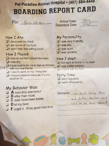 He was returned to me dried gunk in his eyes, dehydrated, with one spot on his backside smelling like a cheap perfume. I had requested and paid 32$ for a bath with ear wash, prior to pick up.... They reported having bathed him that morning. His ears were still dirty, his coat soiled and tail matted with some dried grass tangled in it. They are super nice upfront, but now, I am having some doubts about my puppy's treatment?? What report card? I did not receive a report card!