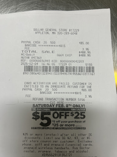 I’m absolutely angry with the store manager, Michael, right now. I tried loading money to my PayPal account and he even told me that I could use my card for the transaction. However, it took my money but didn’t successfully load my money and gave this receipt, stating: customer is entitled to an immediate refund, yet he’s refusing to do that. He keeps saying that he has to call corporate, that they have to do that.