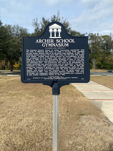 Read moreThe Alachua County Board of Public Instruction contracted with the firm of Winston and Perry to build a 3-story brick building for the Archer School, west of an old wood frame building, in 1917. The building housed grades 1-10 until 1925 when the 11th and 12th grades were added. Archer High School gained its accreditation in 1926, and graduated its first senior class that same year. Construction began in 1936 on a new gymnasium building as part of the New Deal Works Progress Administration Project 1189, and was completed the following year. The gymnasium was used as an auditorium for school activities and sporting events such as basketball. The school continued to offer high school classes until 1951, and in 1954 the school was reduced to grades 1-6 with kindergarten added in 1963. In 1969, the school consolidated with the local African-American school, and moved to a new location. The old brick school was demolished in 1972. This gymnasium building remained. The City of Archer and volunteers rehabilitated the building and reopened it as the Archer Community Center...