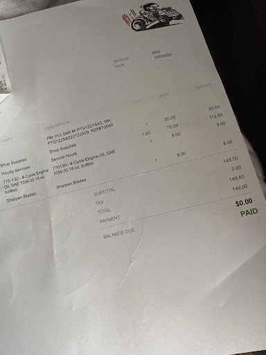 I’m giving 1 star because 0 stars isn’t an option. We took our mower there to have the Carburetor cleaned and that was it. We called 2-3 times a week for a month nearly and every time I actually got to talk to someone they would put me on hold for 45 mins then disconnect. I was told upon dropping it off that they would have it done in a week and a half and if it was going to be more than $150 they would call. It has been 4 weeks and we finally talked to someone who told us it was ready and it was $442!!! I did NOT approve of any other repairs, they didn’t call and get permission to do any of it. They decided to change the battery, install new blades and pulleys. Change the belt that was BRAND NEW when I dropped it off. And put a new carburetor on it instead of cleaning the one that was on it. The carburetor just needed to be cleaned and adjusted that was all I approved of. Now I’m out $442 I didn’t really have to spend because I needed it for other stuff because they didn’t do what they said they would do. I Do NOT recommend taking anything to them to be worked on. Buying a part from them is ok but you can’t trust them to do the...