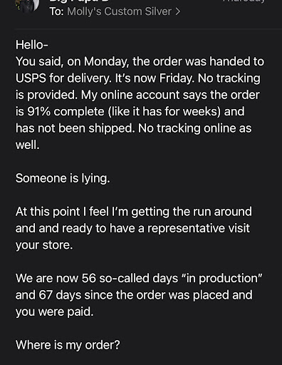 In addition to their technical skill, the customer service at Molly's Custom Silver deserves special mention. They made the process enjoyable and stress-free, always keeping us informed and excited about each stage of production. Their passion for their work and their dedication to making clients happy shine through in every interaction.