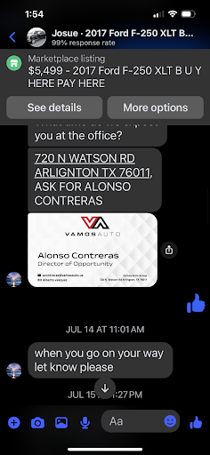 Part 1 is my buying experience. Trying to improve my life, I committed mental, emotional and financial suicide by trusting Vamos Auto. This is the note. I called to see if I qualify earning $6000 a month, was told yes. I got there and was told the bank won't allow me to finance it, but was told its Buy Here Pay Here before I paid for ride there. My vehicle with over 200,000 miles broke down and was taken for non-payment. I ended up buying a 2012 Ford Focus that only seemed to hesitate shifting gears accelerating, a known Ford Focus issue. But they played me for not knowing why, at 10 years old, the car only had 20000 miles. I was told it was only driven occasionally by an old lady. Really, the entire electrical system was dry rotten but the Texas cold weather at time of purchase hid it. I thought something was wrong about a week after purchase when I tried getting in the trunk and called the salesman several times including for sales paperwork, but apparently got blocked and was able to prove it after he picked up with me calling from my second phone. I called the dealer, whether for another key because the one I bought had issues being programmed or me trying to open the trunk or the 1st key button not working with a brand new battery, they would say they would have the service department call me, but it never happened. Either way, I drove the frozen yet decaying car until the Texas heat presented. The hesitation was more noticeable just starting but I didn't know til the weather hit 106 degrees outside. The car's dead 4 months later at 42000 miles and an extended warranty for 24000 miles. I put 22000 miles in 4 months. That was my purpose in seeking a low mile vehicle and paying for extended warranty, I tried to help myself. Why pay $600 a month to have the car die after 1 Year's Worth Of Miles but still owe $21000, on a loan now somehow with my ex-husband as the owner? I was told I only needed a cosigner. I came in then was told I could not finance with my employment even though I called and asked. He said the bank required me to have it but never said this would be my ex-husband's car! I only even asked him after I was already shown vehicles and later told that lie. My ex-husband has better credit plus non-payment would affect his security clearance. I could have just asked him to buy himself a car from a real dealership and allow me to use it. This was why I was told the sales documents would be sent to me. The extended warranty was a lie because I was told there was a package that covers my car's intended use, driving for multiple companies and also doing research for systemic candidiasis before school started because of my rare disability. I even obtained a sign from Uber for my miles accrued. Why would my ex-husband electronically sign an extended warranty for my car but not me who purchased it and drives it? Now it does not include the coverage I was told I am paying for. This was why I never received my loan documents. Either I or my ex-husband will leave the second half of the review for purposes of...