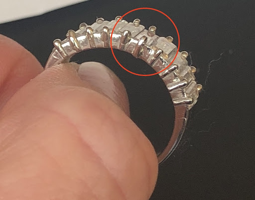 I brought them a ring that was passed down to me from my grandmother after one of the diamonds fell out. They suggested I get the entire ring re-pronged to avoid losing any more (with white gold rather than the platinum of the original prongs). When I got the ring back, the replacement diamond was noticeably smaller than the rest (pic below) and the new prongs were catching on everything.