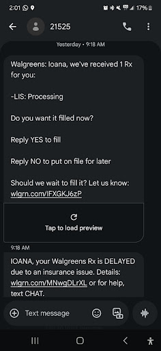 On the morning of Sep 12, I got two messages about my ADHD prescription which is a controlled substance 1. asking me if I want my prescription refilled and 2. Informing me there is an issue with my insurance, therefore my prescription is delayed.