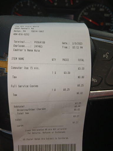 Read moreI shipped a computer from the Aston UPS Store to the computer manufacturer and it arrived at the manufacturer with a cracked screen. I had purchased insurance on the shipment and went into the store to file a claim. I called multiple times over the course of 2 months to check on the claim and was told that the UPS rep that was handling the claim was not in or when she was there she would keep putting me on hold and multiple times would say the claim is still pending. I asked for a claim number and she said that she had submitted it online and there was no claim number. After almost 2 months I called the 1-800 number for UPS and was told that a claim was never filed under that tracking number. I called the Aston UPS store and spoke to the manager, who insisted that his rep had filed the claim, but had no claim number or other proof that a claim had been filed. Ultimately he told me they would not pay for the computer because I had packaged it myself and the store reps had not packaged it. This was never stated when I purchased the insurance. Terrible customer service and managing. I would highly recommend using a different vendor or store to...