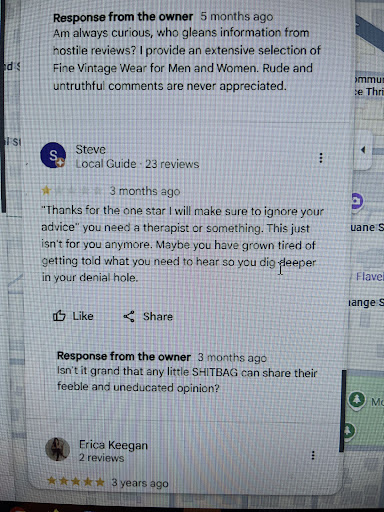 In response to the owner, I noticed you didn't go off on me the way you do with other customers, maybe cause you know I shopped in your stinky, overcluttered store and need customers due to that low two-star rating? That has since dropped one star in 7 months. Gosh, that's bad for a business. Regardless, you are proving my point by replying, not just that, but lying.