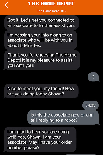 Want to start by saying the store itself was great the personnel was helpful. After ordering a new washer and dryer for our new home that is when it all fell apart. 1st the day before the delivery date (which was already two weeks after the original āready by dateā cause we hadnāt closed on our new home) we get a text (no call no email just a text) stating our delivery that was rescheduled for 6 weeks later. There was link to look at this new schedule but the link didnāt work. 2nd I started reaching out to the numbers and got run around from delivery personnel and doing with out clean close for a month and a half after already paying for a W&D wasnāt setting right and no explanation why. 3rd I decided to reach out to the customer service listed on the app, called the number (it was late) but never got someone to answer that could help (not sure if it was closed but listened to plenty of ringing). Then decided to submit to the chat option and that is when things went from bad to worse. First the associate never introduced he was on the chat so had to ask if it was a person or a robot cause (see attached clip) I couldnāt tell, then was told āyou not allowed to modify your order after it was madeā. That did not sit right when HD is the one that modified the delivery not me. I was then told the only way I could change is if I cancelled my order to reordered items so they could be modified, which really felt like I was being told āget to the back of the line and I help you if I feel like it laterā. As he continued to just blame me and not assist an any way I told him Iāll be headed to Loweās instead he then became very condescending and trying to āhelpā (like almost like a frat boy tries to help a nerd during pledge week!!!) Told him Iām out and now he continues to text me and acting like he wants to help, the most recent text I got he said his name is Alex but I donāt even trust that, but he does have control of the Home Depot account and continues to send texts that are unhelpful, relentless and completely unwanted. I hope HD can get that to stop and someone just talk to me like a human not a number that already paid and has no use to them anymore. But at this point Iām pretty sure that āAlexā made it to where Iām not going to even let them help. Those of you buying supplies you get direct - great store, those that try and get something delivered GOOD LUCK. This was second time trying to schedule something with HD and the second time Iāve been burned by them and this burn was...