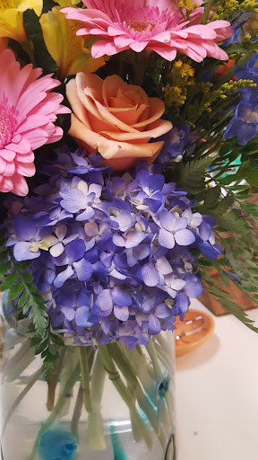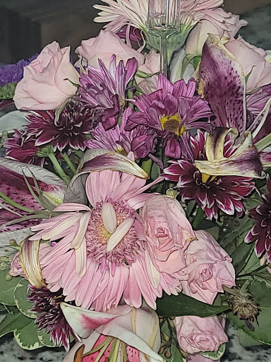Read moreThese photos depict my birthday bouquet from my husband Alan, created by Mike. The next-to-last photo was taken a week ago, and the last photo, with a little rearrangement of blooms, was taken today. The delicate larkspur and the gerbera daisies have chosen to rest, the larkspur's tiny blossoms salvaged to dry. Still, there are blue eryngium and purple blue hydrangea. Fully opened Peach and tiny copper roses. Bells of Ireland, which just today have begun to open their minute hidden white flowers! To express oneself is to give expression in a creative or artistic manner. Mike and Expressions made my husband and me recipients, and they excelled. We are so pleased! Thank you, Mike, for the lovely and unique work of color, texture, and form you created for me, and for Alan. You are the best!
