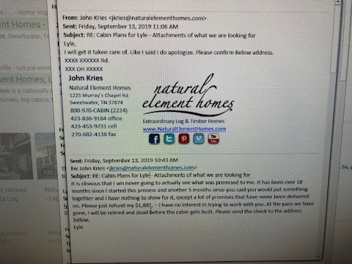 Read moreWe are very disappointed in our experience with Robert Lambert, owner and president of both Big Timber Builders and Natural Elements Homes. Initially we thought we had a good working relationship with Mr. Lambert and his associates. Zoltan was always responsive and helpful. Diane was creative and patient as we fine-tuned our plan. Randy provided a lot of good ideas. But then, after many months of planning, we feel like we were "ghosted." Even though I had an appointment with Randy, and went to the home office 30 miles from my home, he was in another meeting, and did not acknowledge my presence or apologize for not seeing me. He was supposed to be our project manager. He was replaced by Dylan who was far less experienced and not familiar with our project when he came on site. On multiple occasions, both by email and phone, we asked Robert for an estimate on our home. For several months we were told he almost had it done. At Robert's direction we spent over $10,000 getting everything ready for construction that we could - cutting down 6 huge, beautiful trees, getting soil tests and a septic permit, recording a deed in order to get an address and the driveway permit, meeting with utility representatives to arrange for temporary power. When we finally ran out of patience and emailed Robert that we decided to not build, he did not even respond to the email. My advice: DON'T WASTE YOUR...