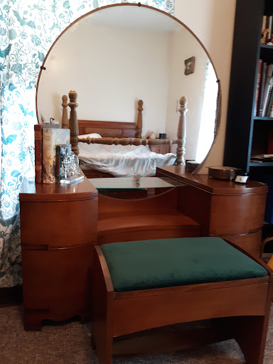 In one front bay you'll see furniture - some antique, some MCM, some upholstered pieces blocking a fine display of early-20th Century ceramic Wall Pockets; across the aisle, glass cases of iocal jewelry, some lovely pieces of indigenous artifacts, odd little bits of silver & vintage traditional costume accessories - there's more vintage pottery & glass (Fiesta Ware to Royal Bayreuth) .