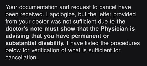 Read ABC’s email response to me in the first photo and then the screenshot of their medical cancellation options in my agreement. I provided a copy of my doctor’s recommendations and they still refuse to let me cancel my membership. I have an ongoing medical condition that will prevent me from weightlifting but they are changing the language of what the agreement states by saying “the doctor's note MUST show that the Physician is advising that you have permanent or substantial disability.”