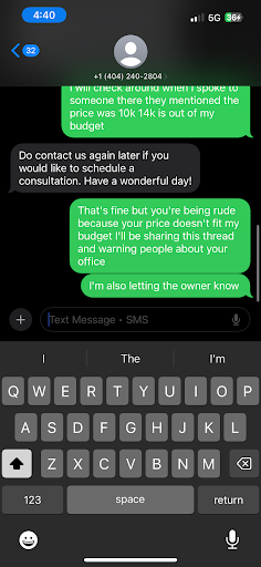 They quickly told me that they CANNOT show me proof of the $1,500 fees they charge for their consultations because of “privacy reasons.” So, not only are they telling me that I HAVE to pay the amount of $1,326.00, but they also have no paperwork to validate that this is a legitimate price!