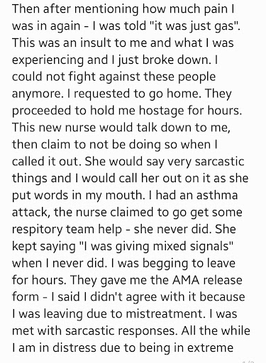 All of this so far I could explain away with how understaffed this hospital was. I was trying to be patient and understanding despite how depressed and demoralized I felt. I understood that without those digital records they had to take my word for it - but it was still exceptionally painful to not be taken seriously. They wouldn't give me any relief for the pain either beyond what they gave me in the ER. They would only ever offer anti-vomiting meds and tylenol.