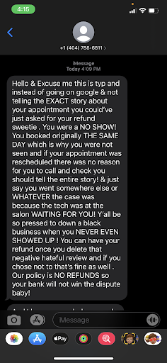 Read moreUPDATE: The owner had her assistant/receptionist call me asking to take down my review. Since I do not answer calls from unknown numbers, Tierra left a voicemail. Sadly, I am unable to post the voicemail, but I did email a copy of it to the owner since she claims I failed to show. She is more concerned with the negative review, although she has PLENTY already!