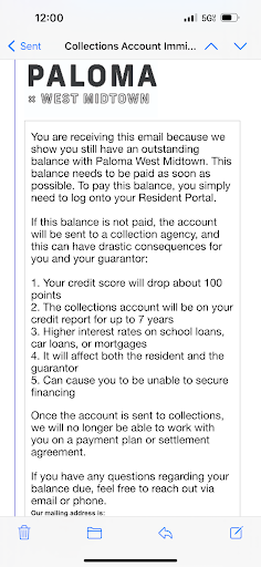 Cons Garbage truck comes at 6:50am almost daily and is EXTREMELY loud. It empties huge metal containers, which sound like car crashes when they bang on truck or road. Very irritating if you stay up late studying/working. Thin walls, can hear my upstairs neighbor walking late at night, making it difficult to sleep. Thin windows, cars, trains, and people are very noisy inside the apartment. Some bars and nightlife on Marietta Street, resulting it very loud people at times.. Pipes freezing and broken pipes resulting in flooding. This flooding resulted in an over long month clean up and restoration which was understandably loud at times and inconvenient. Sometimes water would bubble up from bathroom sink, toilet, and shower, resulting in dirt residue. Elevator is frequently out of order, one time for 10+ days. First floor stair access card reader is broken, so you have to walk down to the bottom floor of the parking garage. Poor outdoor maintenance, puke (drunk people from bars) and rotting spilled food is common occurrence outside the building. Even saw human feces. WiFi would frequently go out (Paloma's provider's fault). Extra fees (all apartments do this) and less than one year lease (little over 11 months) but still pay for 12 months. While may be safer than apartments in Midtown, there are still frequently homeless people outside, asking for money, sleeping in parking garage, etc. Garbage chute is almost always overflowing, attracts flies and smells terrible. May sound benign, but the road to cross to campus can be quite dangerous. Drivers are speeding and do not typically stop for pedestrians. Packages are frequently left in an insecure location, so could get stolen. I personally did not have...