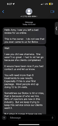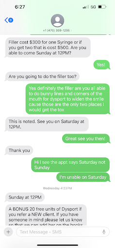 Read moreI’m honestly more embarrassed with myself for even thinking this place was a good idea. I don’t go cheap when it comes to my face but I thought $2 a unit too good to be true right?!! RIGHT. I normally get my injections done at my dermatologist and decided I’ll try something new. You truly get what you pay for it’s so enticing how cheap it is. However don’t go cheap for Botox or Dysport just don’t. I received a Groupon for this place (first red flag) and came in to get Dysport. I’ve had Dysport in the past few months right before my wedding no issues. The appointment went great they were super nice and seemed knowledgeable. I even let the girl experiment on my face and put Dysport in my chin (this is my fault so I’m not even mad I just recognize how dumb I was). So seemed great no issues. I scheduled actually another appointment for today to get filler. But about two days ago the side effects kicked in and I started experiencing double vision which I’ve never had happen before and my smile droops almost like I’ve had a stroke. So immediately I decided I’m not getting filler but I do want to consult them about what’s happening. When I showed up for my appointment today and none of the injection nurses showed up. The sweet nurse on call Dana was calling the owner and trying to get in contact with anyone. No one answered their phone. Finally she gave me the number of the owner because I was worried I needed to see a neurologist (which I am going to see because I mean I’m having trouble driving now) After a few hours the owner apologetically got back to me and offered me free microdermabrasion which kind of her but no thank you you guys are not going anywhere near my face again. I give the owner grace too because she was moving and not her fault the nurse messed up her scheduled time. I’m not even upset about the results again for $2 a unit they could be injecting water for all I know but more so that I sat there for 30 minutes with no answers. Finally they asked me if I wanted to reschedule another time and I said absolutely not considering there’s no guarantee anyone would show up. I should have known it would go wonky when the girl got the days mixed up for the booking. Again I don’t know how I expected any different. All that to say is just be careful don’t cheap out on filler and Botox. Go to an actual professional like a dermatologist or even Dermani Med Spa is amazing been going to them for years I’m going to see if they can fix this stroke face. Just pay the extra money it’s worth the investment trust me. This has been a learning lesson for me for now I will just be half blind till this thing wears off.