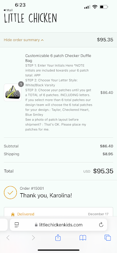 I wish I could give zero stars. I ordered 2 custom duffle bags for my kids on December 3rd. I received an email on December 18th that they made a mistake on my sonâs bag but they were all sold out of the print I chose. They asked if I asked if I could switch to a different print- I emailed back that day 2 hours later asking what the mistake was and if it wasnât the initials then just to send it anyway as I needed it for Christmas. It is now December 20th- I have written multiple emails and I have gotten no response. No one picks up phone number listed on their email - it just rings and rings. Currently their website says up to 10 days for custom orders due to holiday rush. Itâs now been 17 days since I placed the order. Not to mention- where is my daughterâs duffle bag and hat that I ordered?!?!
